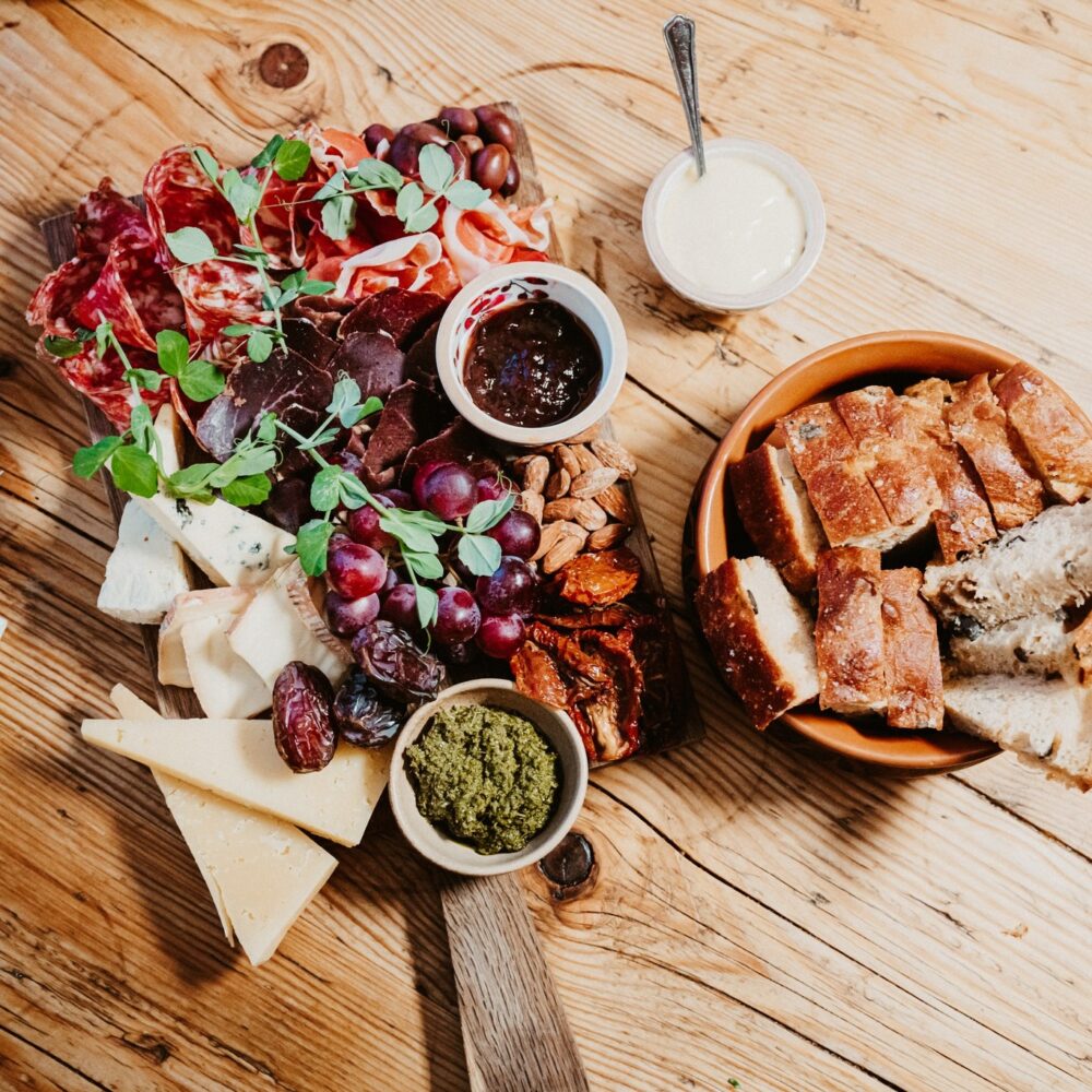 Á tapasbrettinum er millum annað: Trý sløg av turkaðum kjøti, trý sløg av ostum, saltaðar mandlur, heimabakað breyð, pesto og súltað grønt.